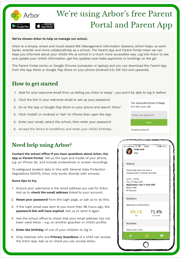 We’ve chosen Arbor to help us manage our school. Arbor is a simple, smart and cloud-based MIS (Management Information System), which helps us work faster, smarter and more collaboratively as a school. The Parent App and Parent Portal mean we can keep you informed about your child’s life at school in a much more accessible way. Log into Arbor to see and update your child’s information, get live updates and make payments or bookings on the go! The Parent Portal works on Google Chrome (computer or laptop) and you can download the Parent App from the App Store or Google Play Store on your phone (Android 5.0; iOS 10.0 and upwards).
